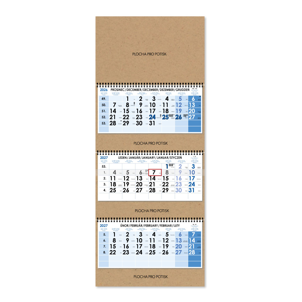 Trojmesačný kalendár Trio Kraft skládaný český so špirálou 2027 - modrý