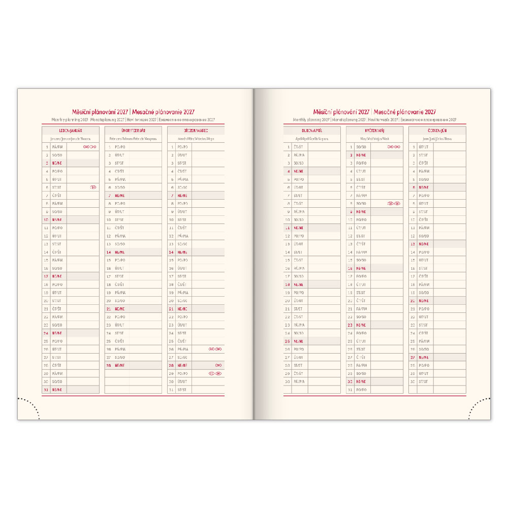 Diár obsahuje: miesto pre osobné údaje, mesačné plánovanie 2026 a 2027,