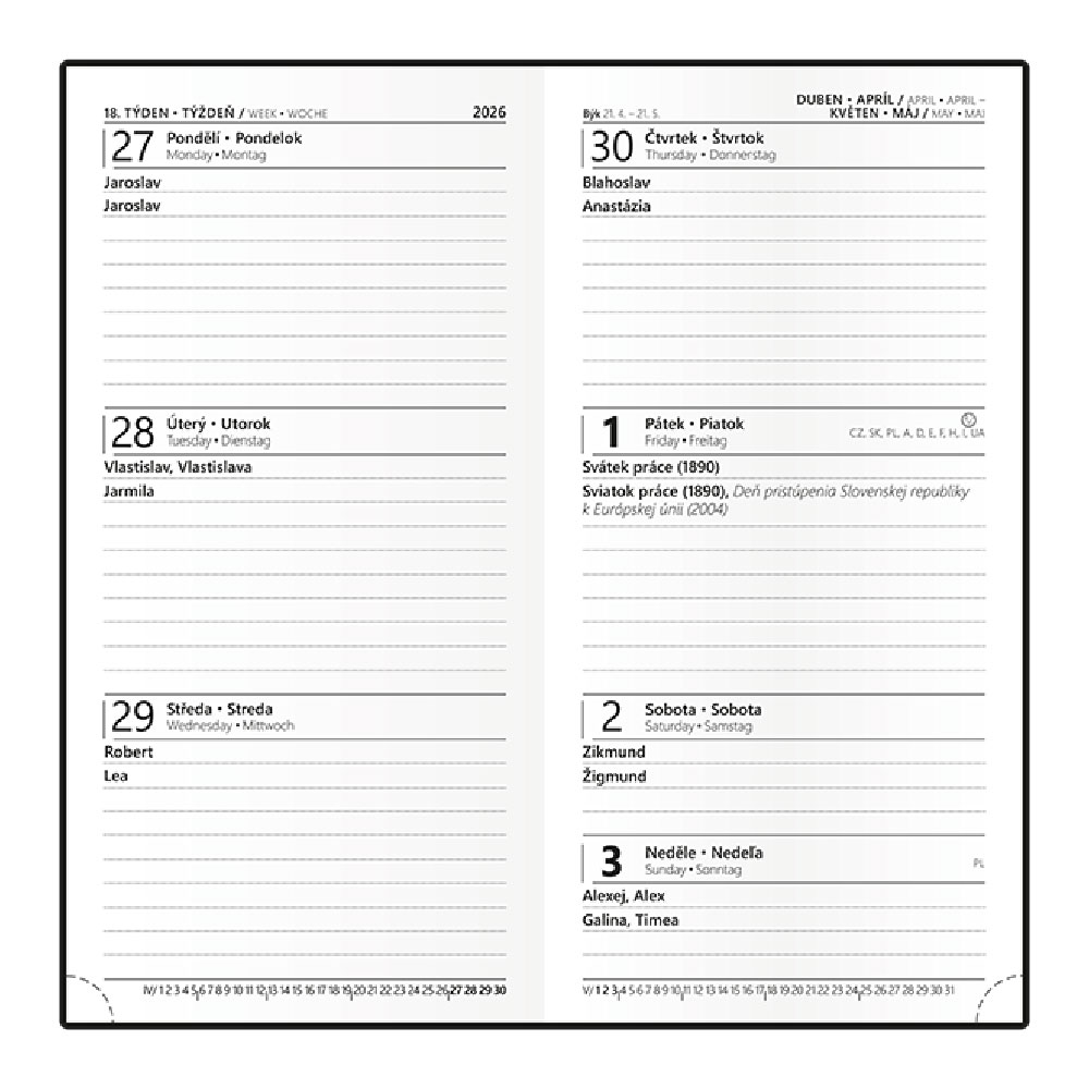 ročný plánovací kalendár CZ, miesto na poznámky.