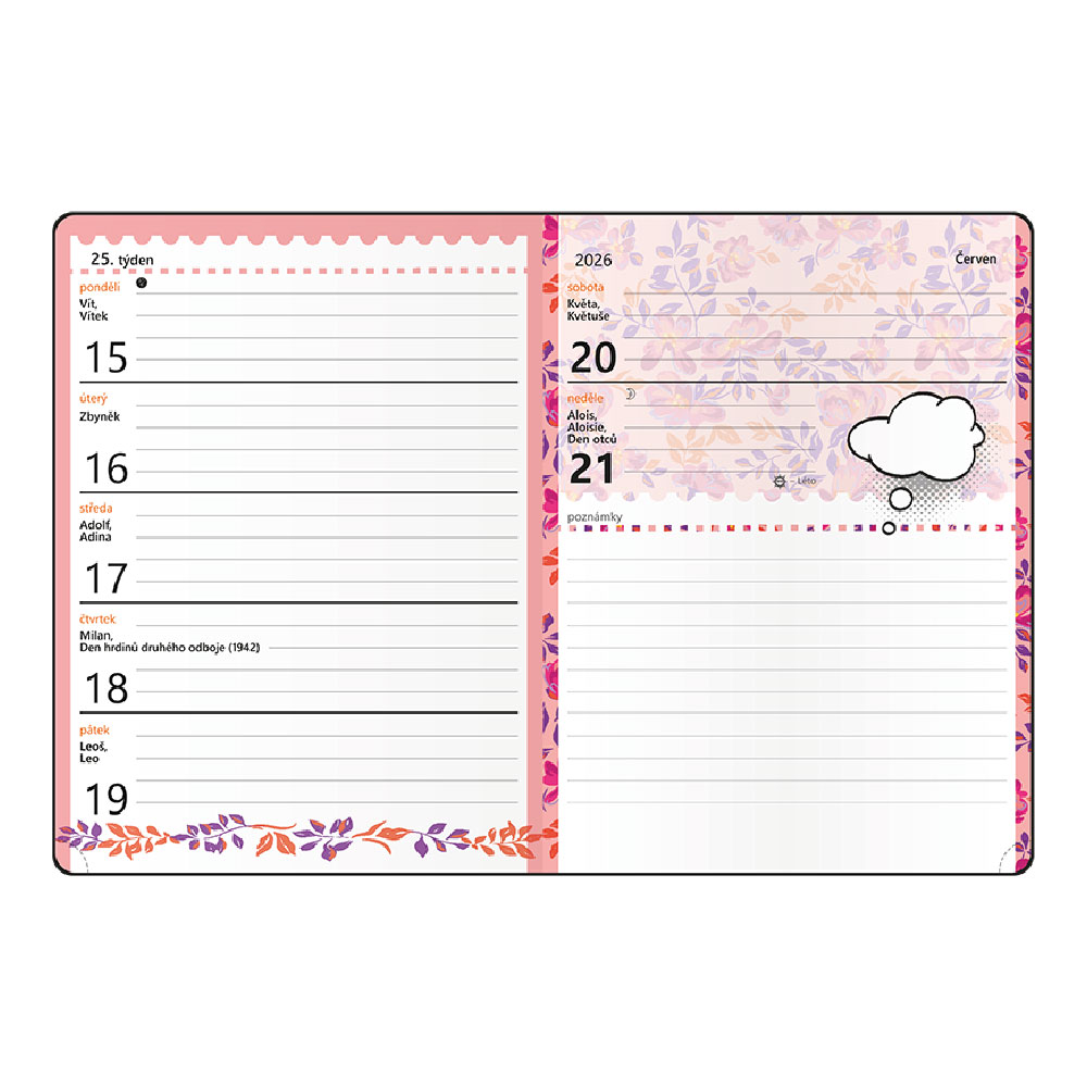 Farebný trendy motív a praktický formát do vrecka robí z diára cool doplnok.
