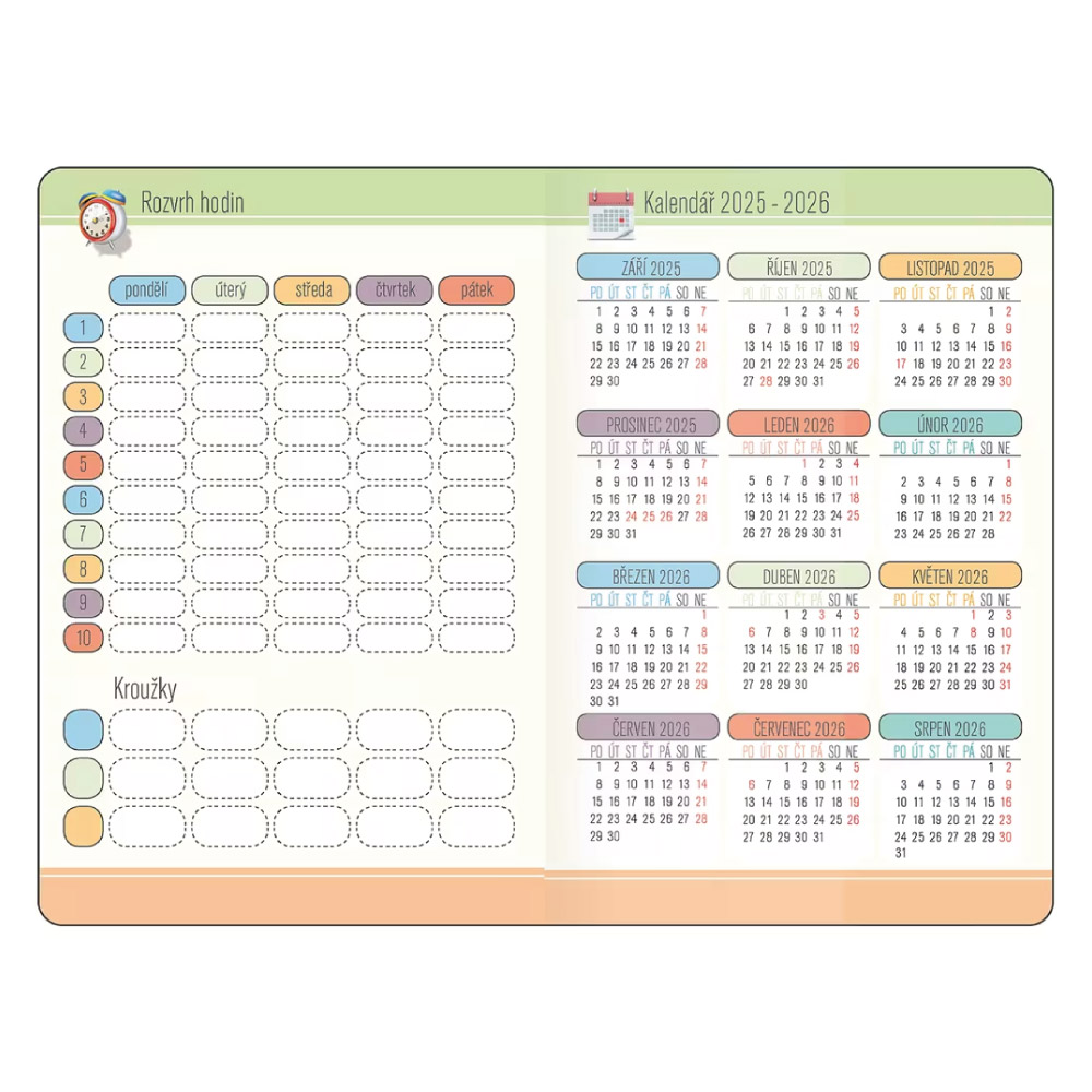 Obsahuje: rozvrh hodín, adresár, prehľad prázdnin, poznámky,