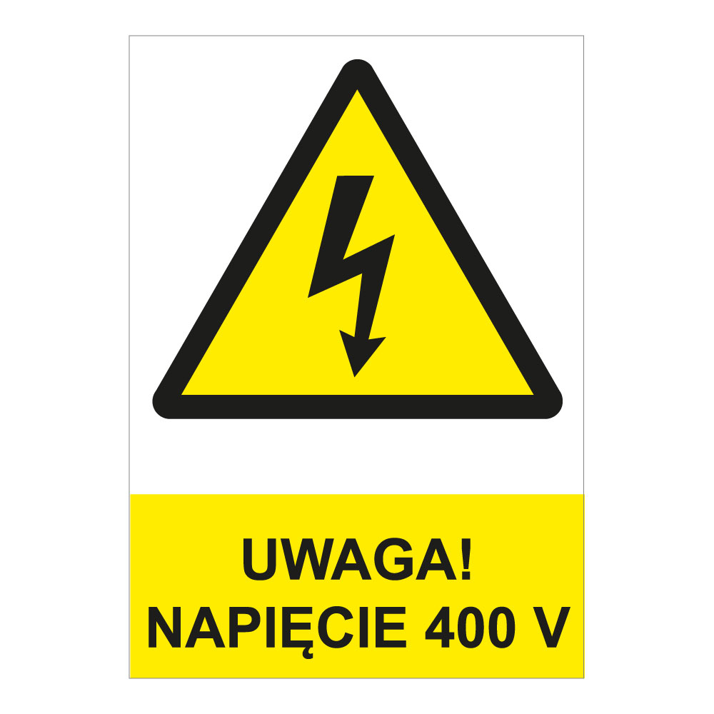 UWAGA! NAPIĘCIE 400 V - znak BHP, 2 mm płyta PVC A4
