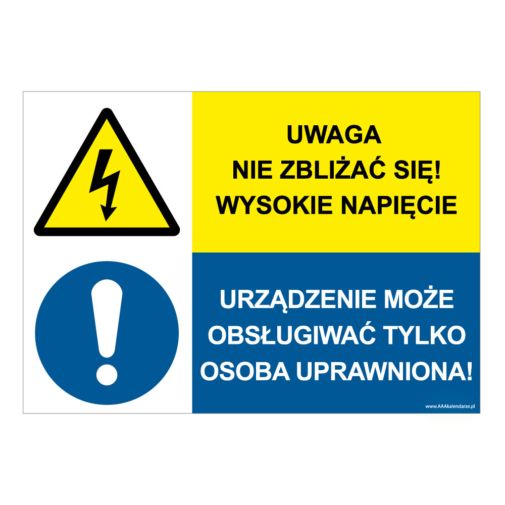 UWAGA NIE ZBLIŻAĆ SIĘ! WYSOKIE NAPIĘCIE - URZĄDZENIE MOŻE OBSŁUGIWAĆ TYLKO..., ZNAK ŁĄCZONY, płyta PVC 1 mm, 297x210 mm