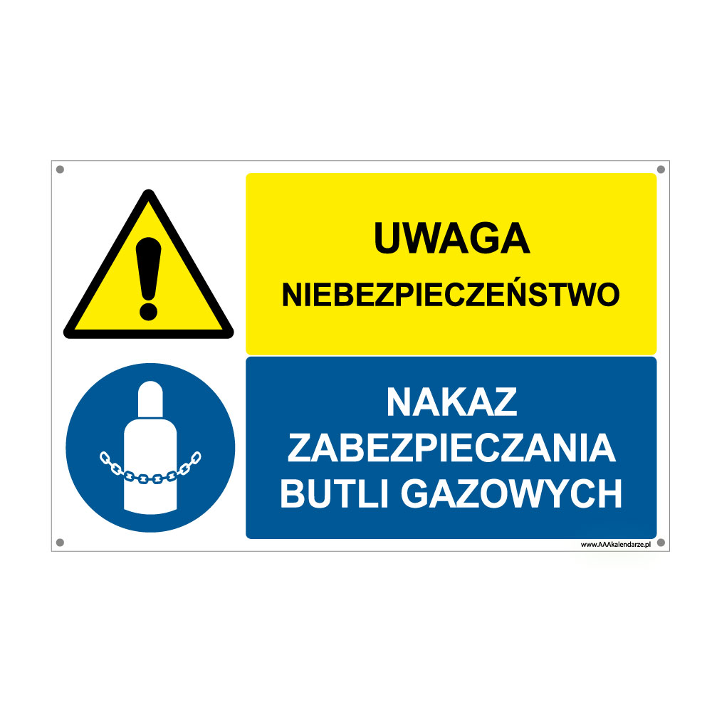 UWAGA NIEBEZPIECZEŃSTWO - NAKAZ ZABEZPIECZANIA BUTLI GAZOWYCH, ZNAK ŁĄCZONY, płyta PVC 1 mm, 95x60 mm