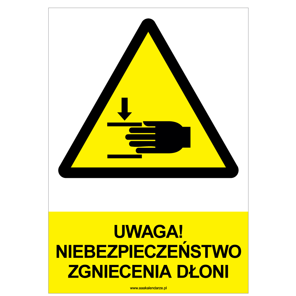 UWAGA! NIEBEZPIECZEŃSTWO ZGNIECENIA DŁONI - znak BHP, płyta PVC A4, 2 mm