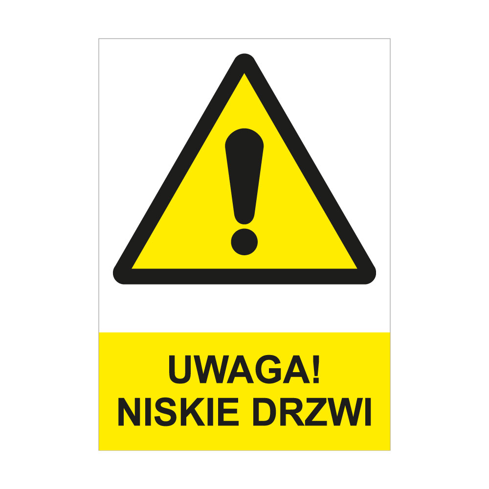 UWAGA! NISKIE DRZWI - znak BHP, płyta PVC A4, 2 mm