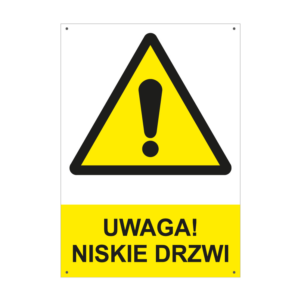 UWAGA! NISKIE DRZWI - znak BHP z dziurkami, płyta PVC A4, 2 mm