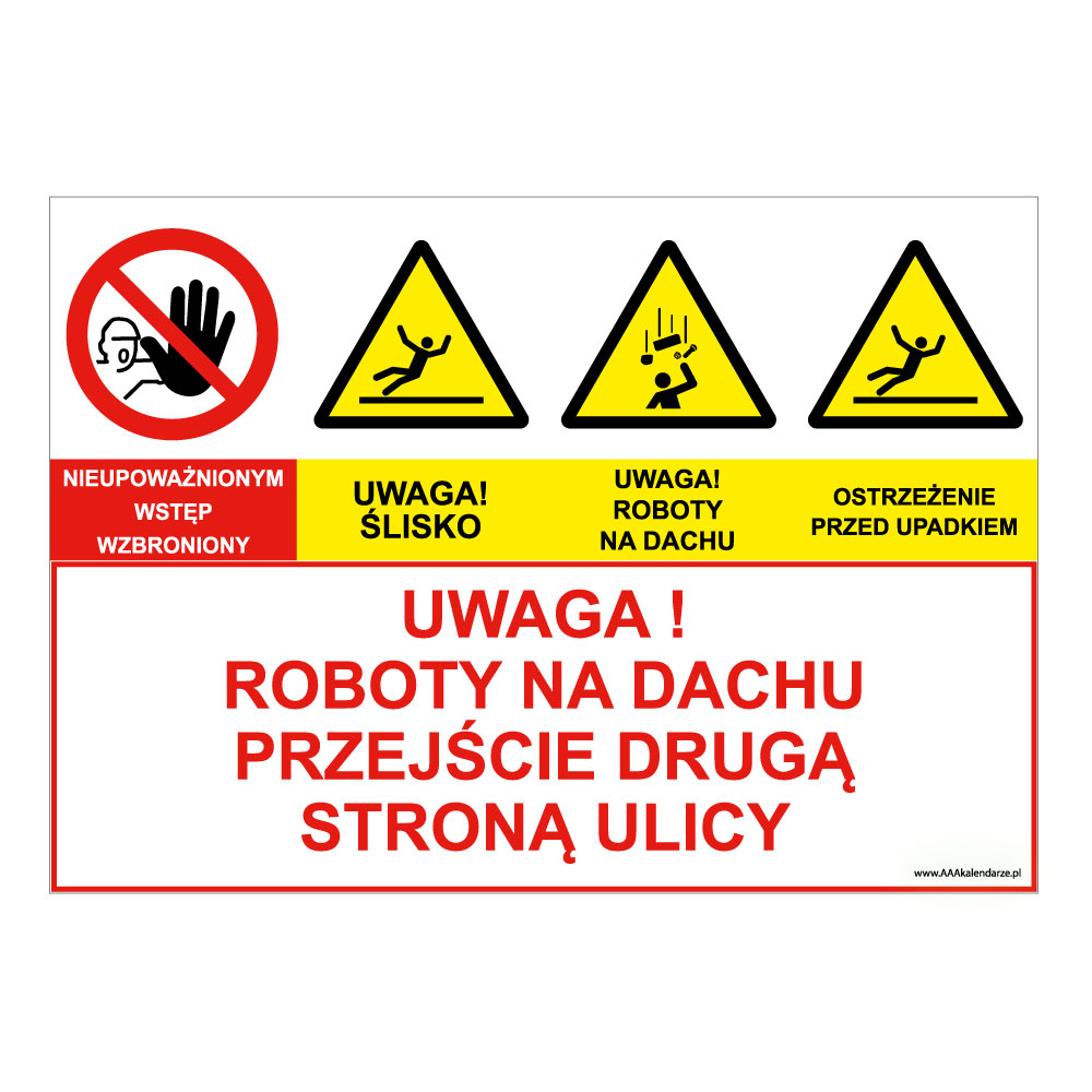 UWAGA! ROBOTY NA DACHU. PRZEJŚCIE DRUGĄ STRONĄ ULICY, ZNAK ŁĄCZONY, naklejka 210x148 mm