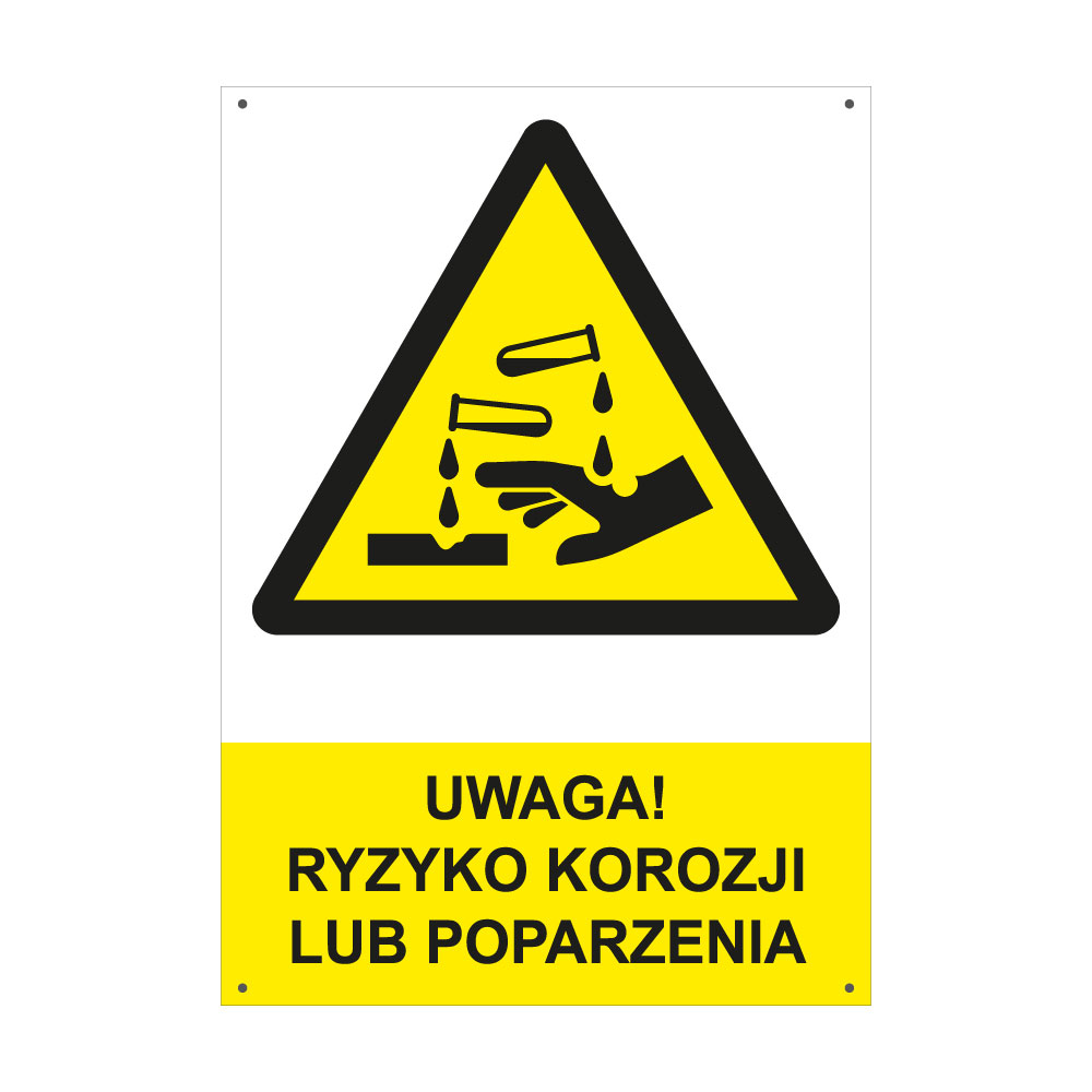 UWAGA! RYZYKO KOROZJI LUB POPARZENIA - znak BHP z dziurkami, płyta PVC A4, 2 mm