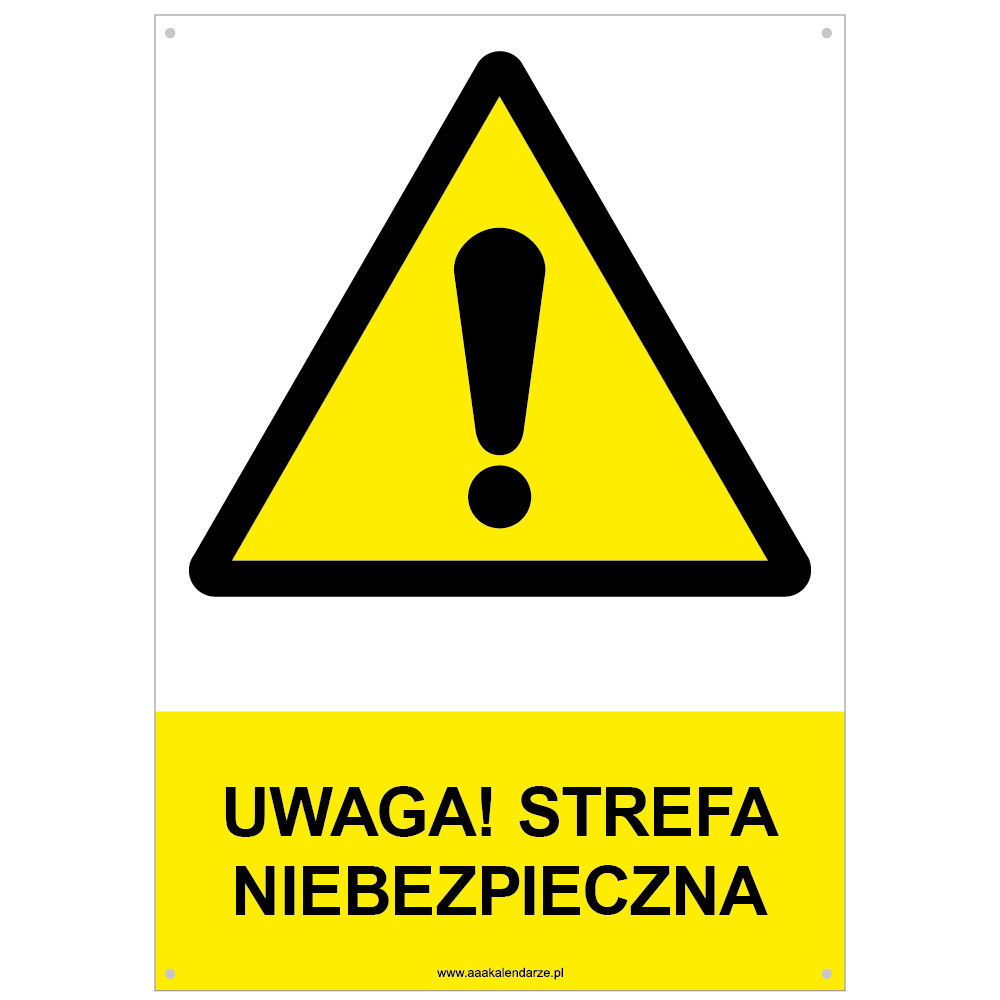 UWAGA! STREFA NIEBEZPIECZNA - znak BHP z dziurkami, płyta PVC A4, 2 mm