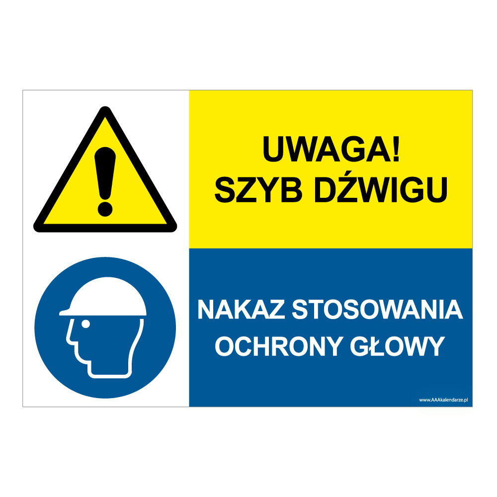 UWAGA SZYB DŹWIGU - NAKAZ STOSOWANIA OCHRONY GŁOWY, ZNAK ŁĄCZONY, płyta PVC 2 mm, 297x210 mm