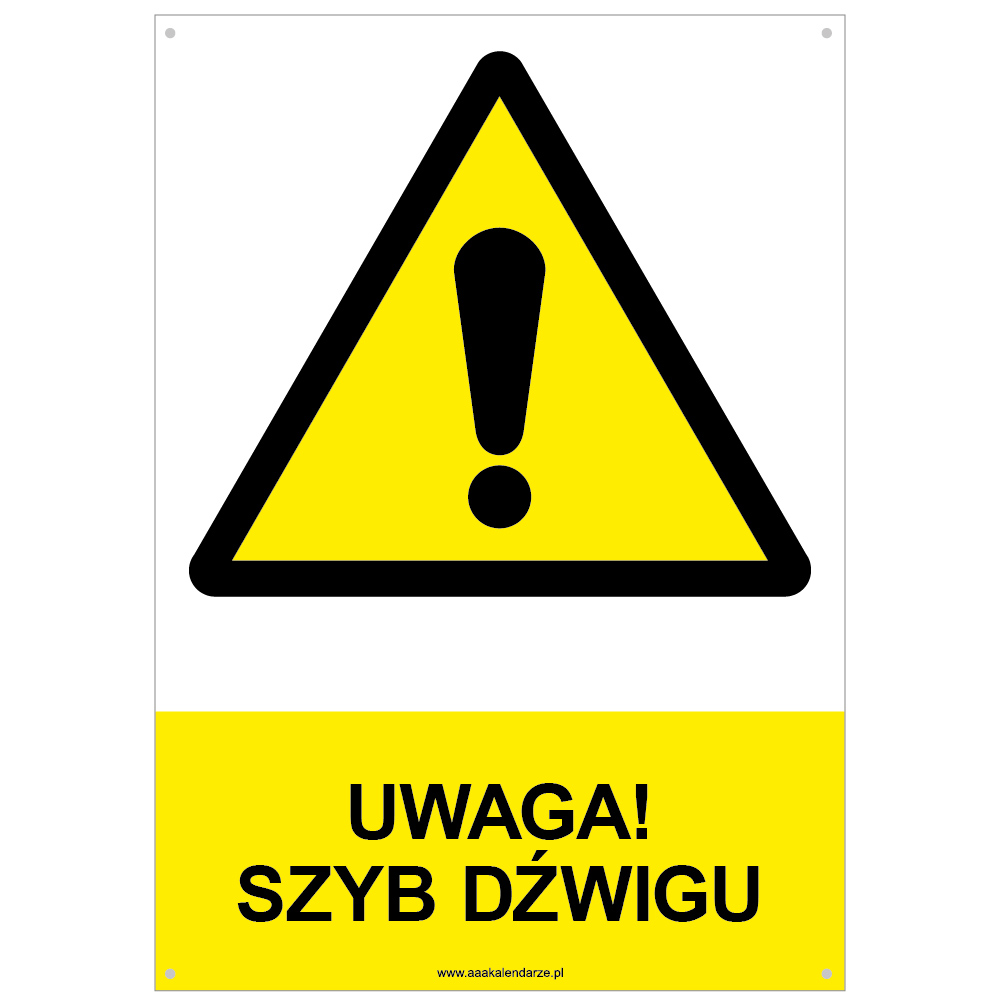 UWAGA! SZYB DŹWIGU - znak BHP z dziurkami, płyta PVC A4, 2 mm