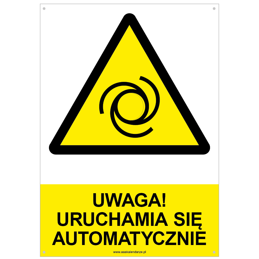 UWAGA! URUCHAMIA SIĘ AUTOMATYCZNIE - znak BHP z dziurkami, płyta PVC A4, 2 mm