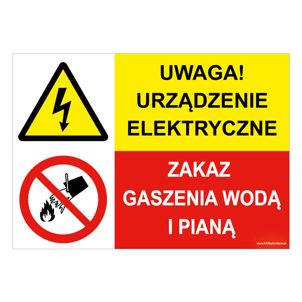UWAGA! URZĄDZENIE ELEKTRYCZNE - ZAKAZ GASZENIA WODĄ I PIANĄ, ZNAK ŁĄCZONY, naklejka 297x210mm