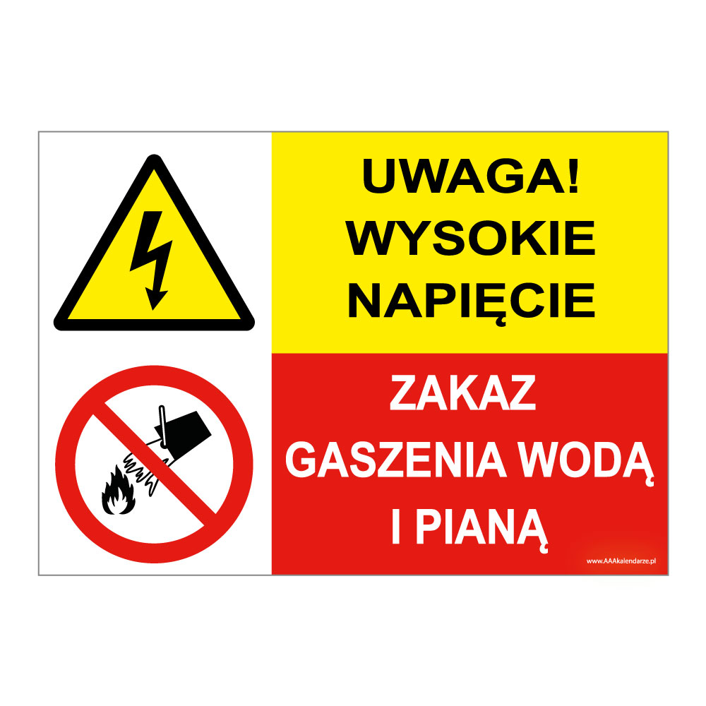 UWAGA! WYSOKIE NAPIĘCIE... - ZAKAZ GASZENIA WODĄ I PIANĄ, ZNAK ŁĄCZONY, naklejka 297x210 mm