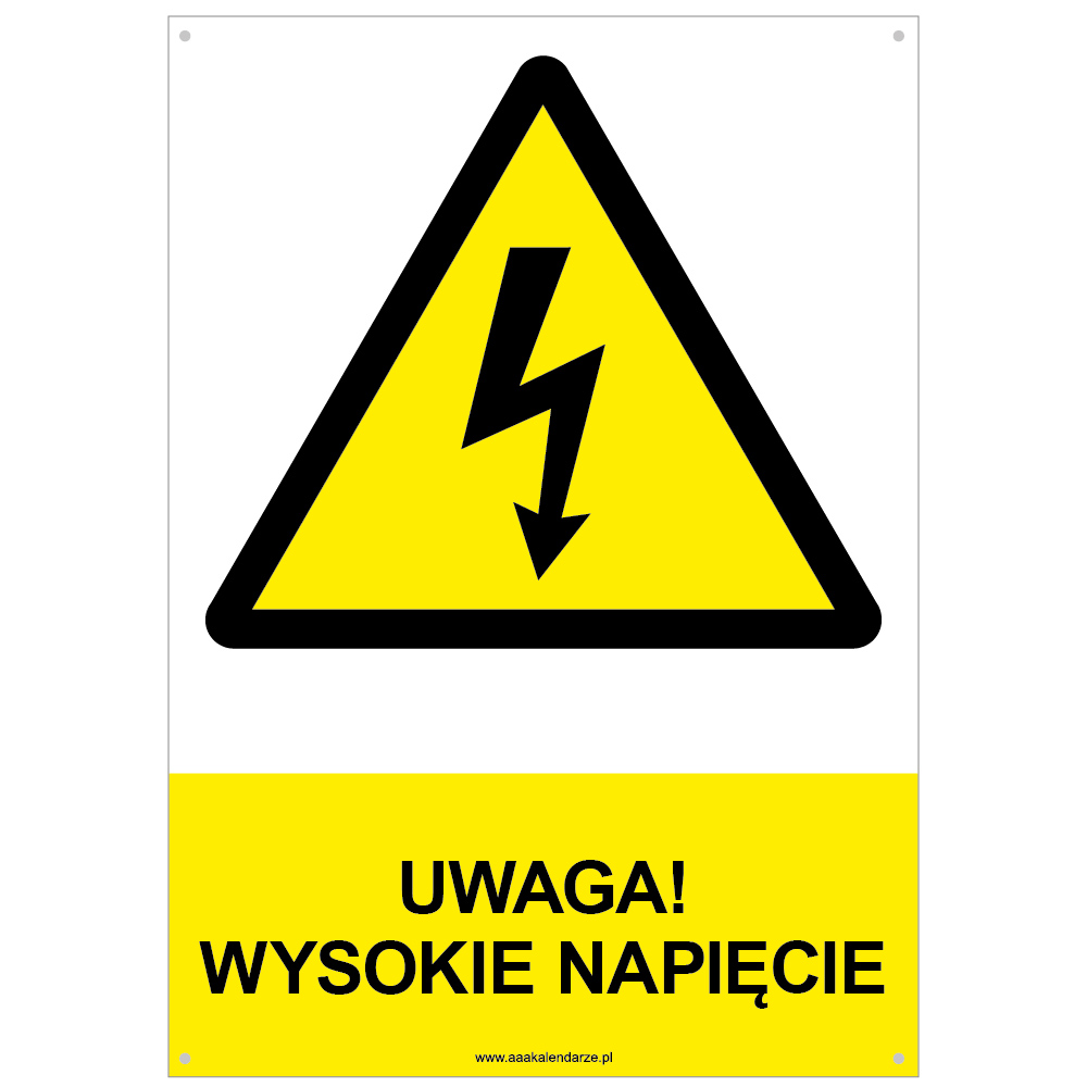 UWAGA! WYSOKIE NAPIĘCIE - znak BHP z dziurkami, płyta PVC A4, 2 mm