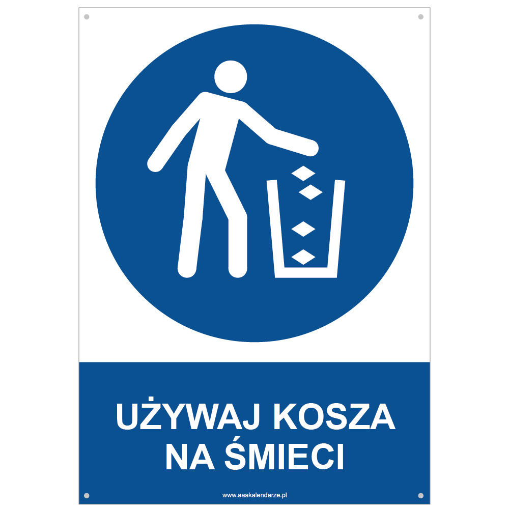 UŻYWAJ KOSZA NA ŚMIECI - znak BHP z dziurkami, płyta PVC A4, 2 mm