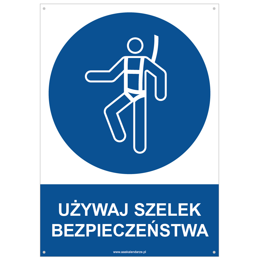 UŻYWAJ SZELEK BEZPIECZEŃSTWA - znak BHP z dziurkami, płyta PVC A4, 2 mm