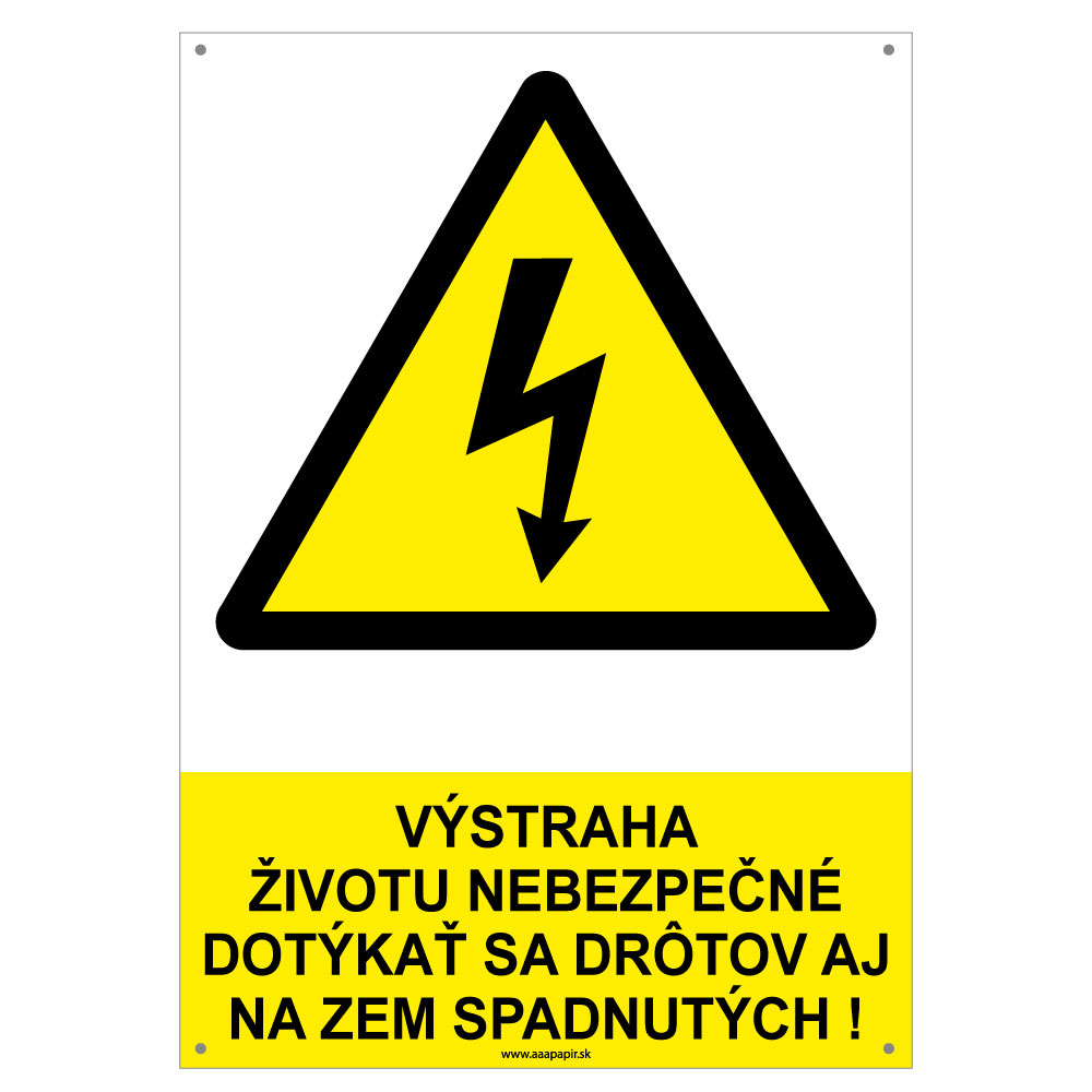 Výstraha, životu nebezpečné dotýkať sa drôtov aj na zem spadnutých! - bezpečnostná tabuľka s dierkami, plast 2 mm - A4