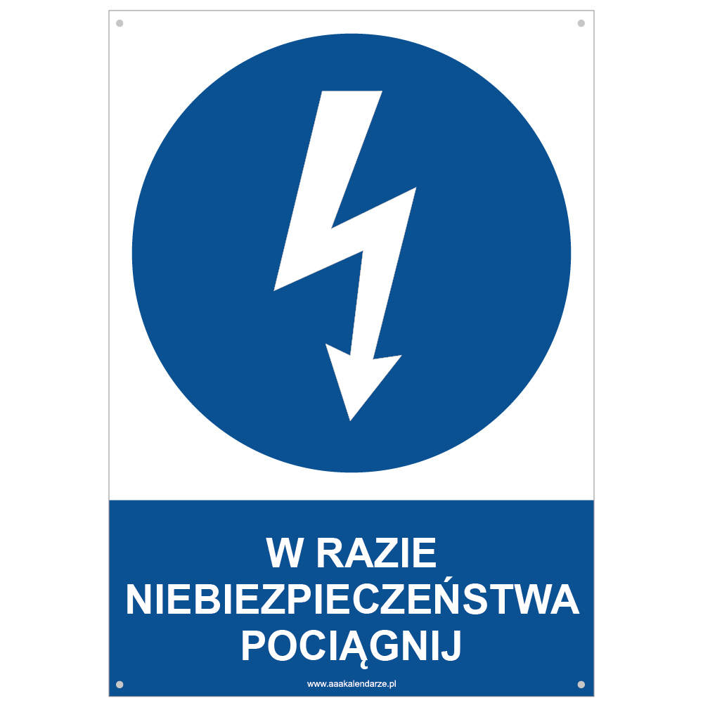 W RAZIE NIEBEZPIECZEŃSTWA POCIĄGNIJ - znak BHP z dziurkami, płyta PVC A4, 2 mm