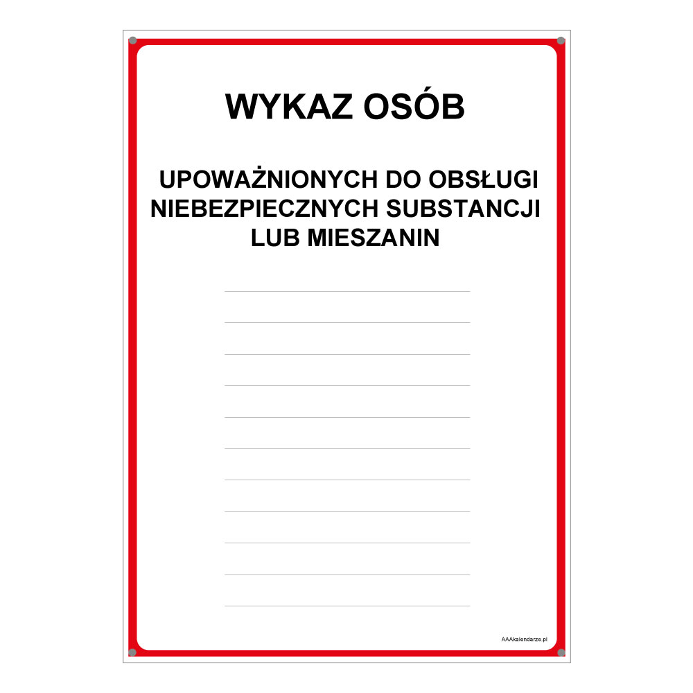 WYKAZ OSÓB UPOWAŻNIONYCH DO OBSŁUGI NIEBEZPIECZNYCH SUBSTANCJI LUB MIESZANIN NA MAGAZYNIE, płyta PVC 1 mm, 210x297 mm
