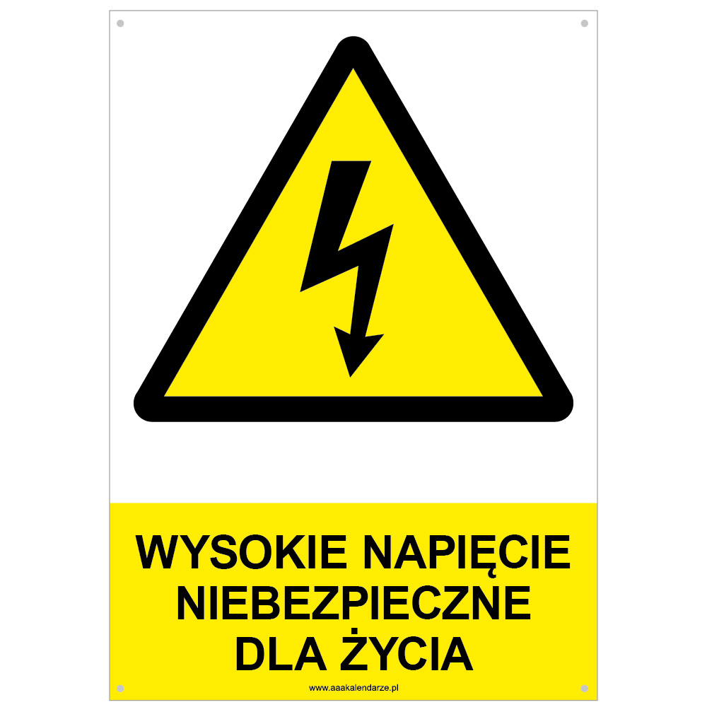 WYSOKIE NAPIĘCIE NIEBEZPIECZNE DLA ŻYCIA - znak BHP z dziurkami, płyta PVC A4, 2 mm