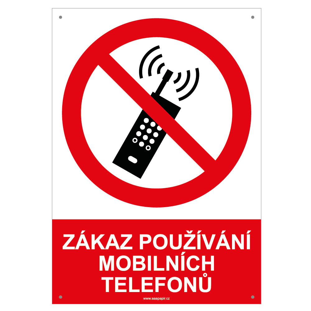 ZÁKAZ POUŽÍVÁNÍ MOBILNÍCH TELEFONŮ - bezpečnostní tabulka s dírkami, plast A5, 2 mm