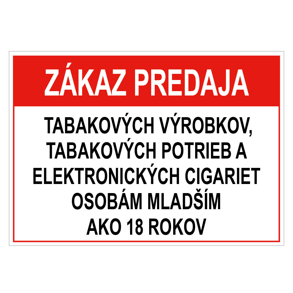 Zákaz predaja tab. výr., potrieb a el. cigariet osobám mladším 18 - bezpečnostná tabuľka, plast 2 mm, A4