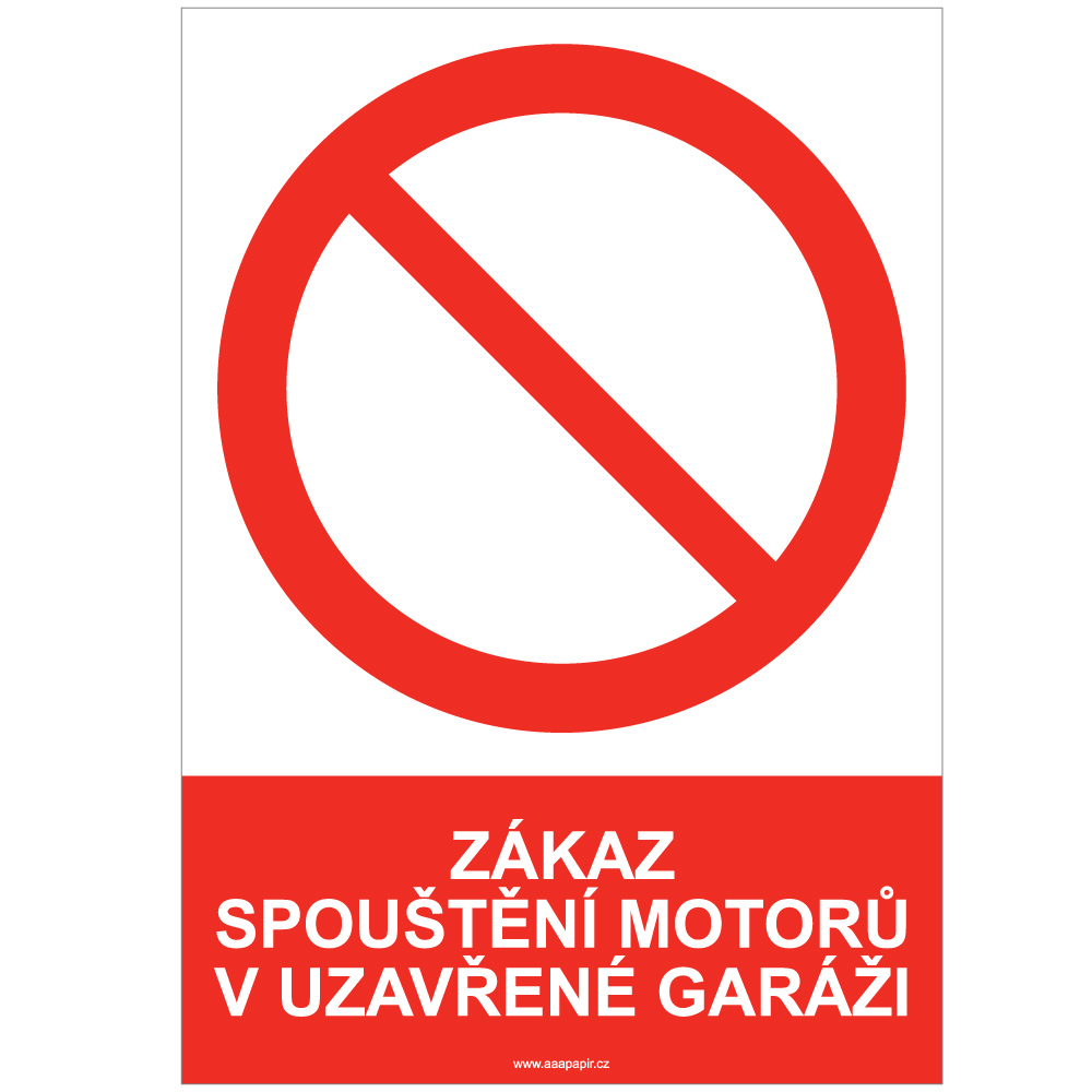 ZÁKAZ SPOUŠTĚNÍ MOTORŮ V UZAVŘENÉ GARÁŽI - bezpečnostní tabulka, samolepka A5