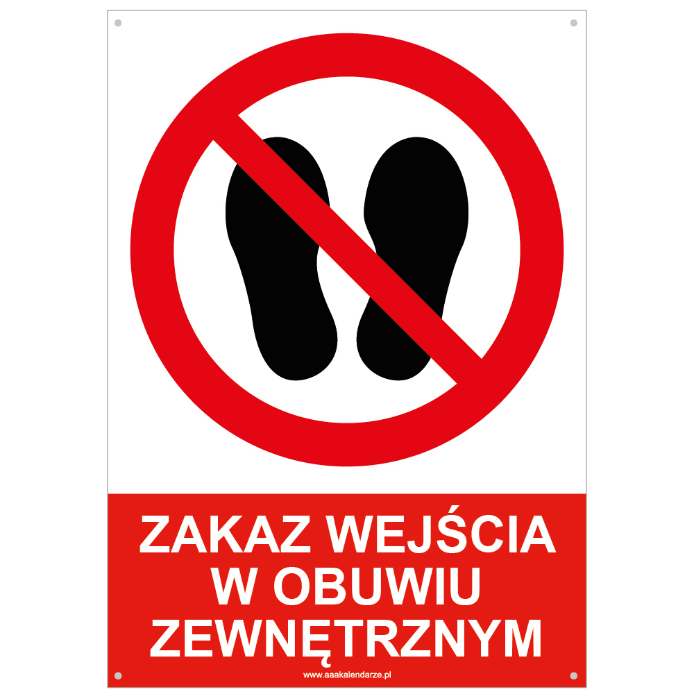 ZAKAZ WEJŚCIA W OBUWIU ZEWNĘTRZNYM - znak BHP z dziurkami, płyta PVC A4, 2 mm