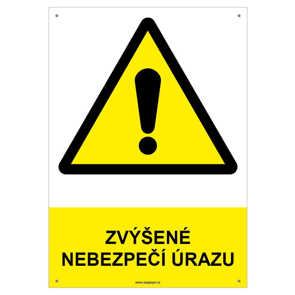 ZVÝŠENÉ NEBEZPEČÍ ÚRAZU - bezpečnostní tabulka s dírkami, plast A4, 2 mm